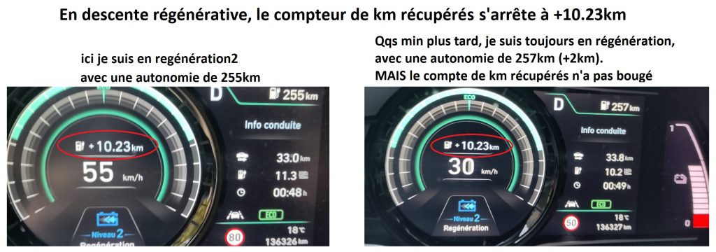 J’ai identifié un bug dans l’affichage des km récupérés. Il m’arrive très souvent de faire des routes de montagne et dans la descente il arrive que je reste en régénération sans toucher l’accélérateur jusqu’à 10min (Et oui je suis dans un coin bien montagneux).