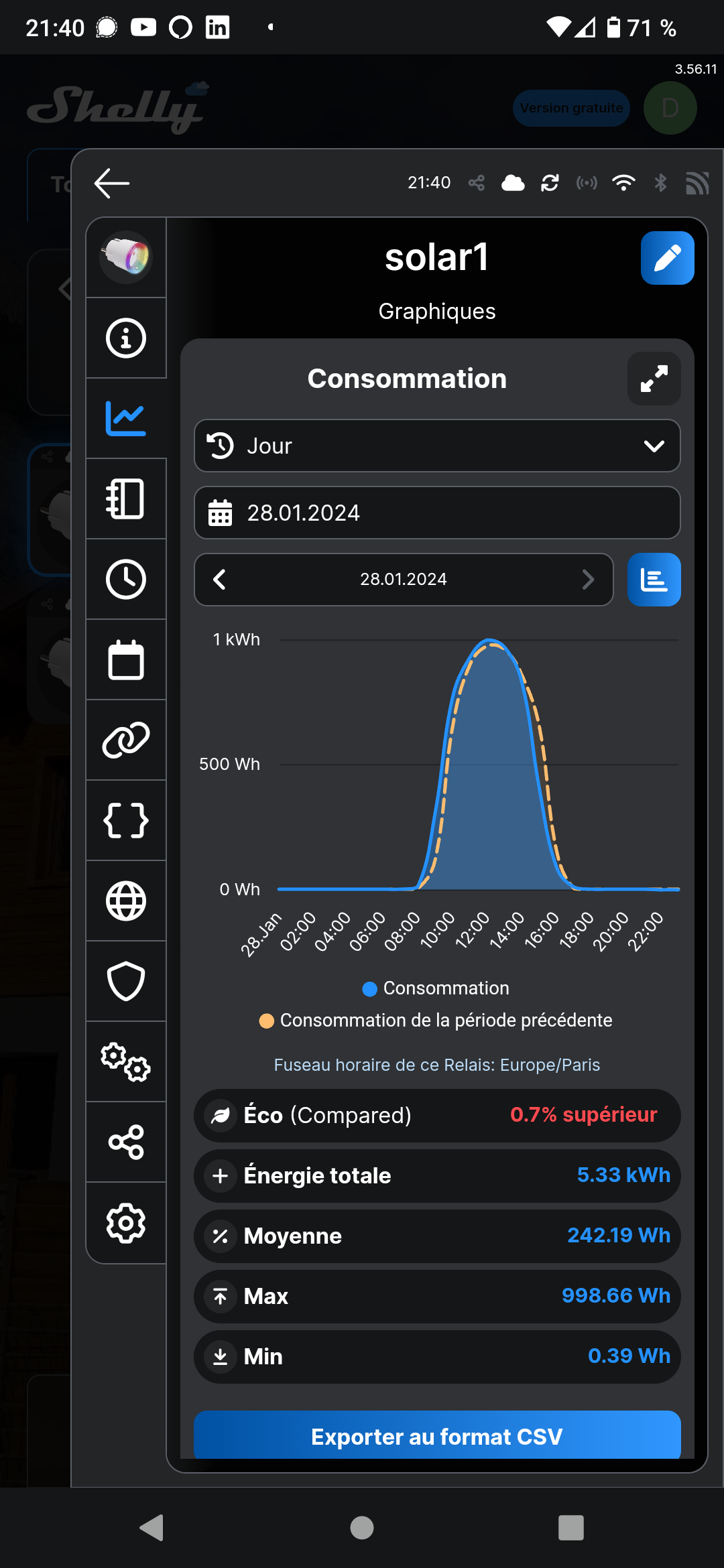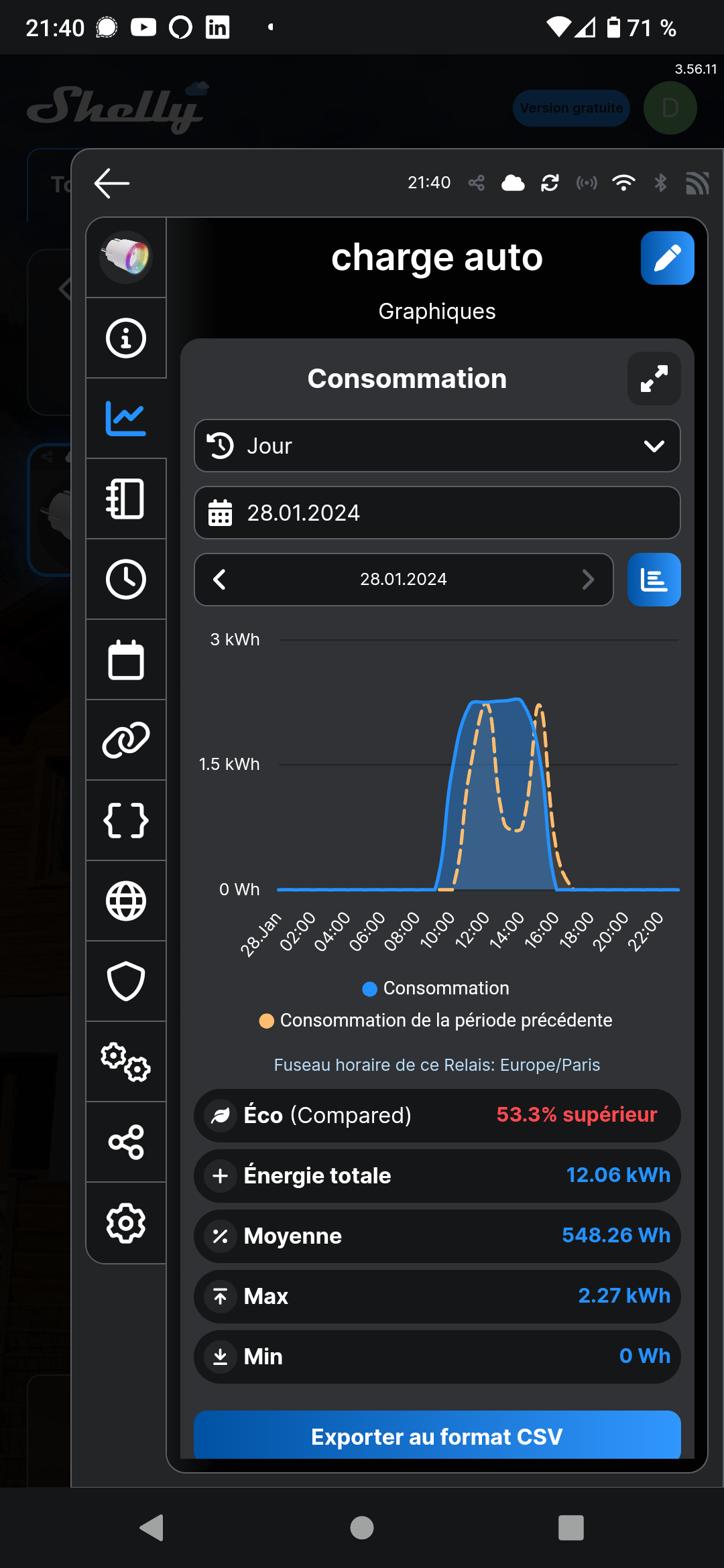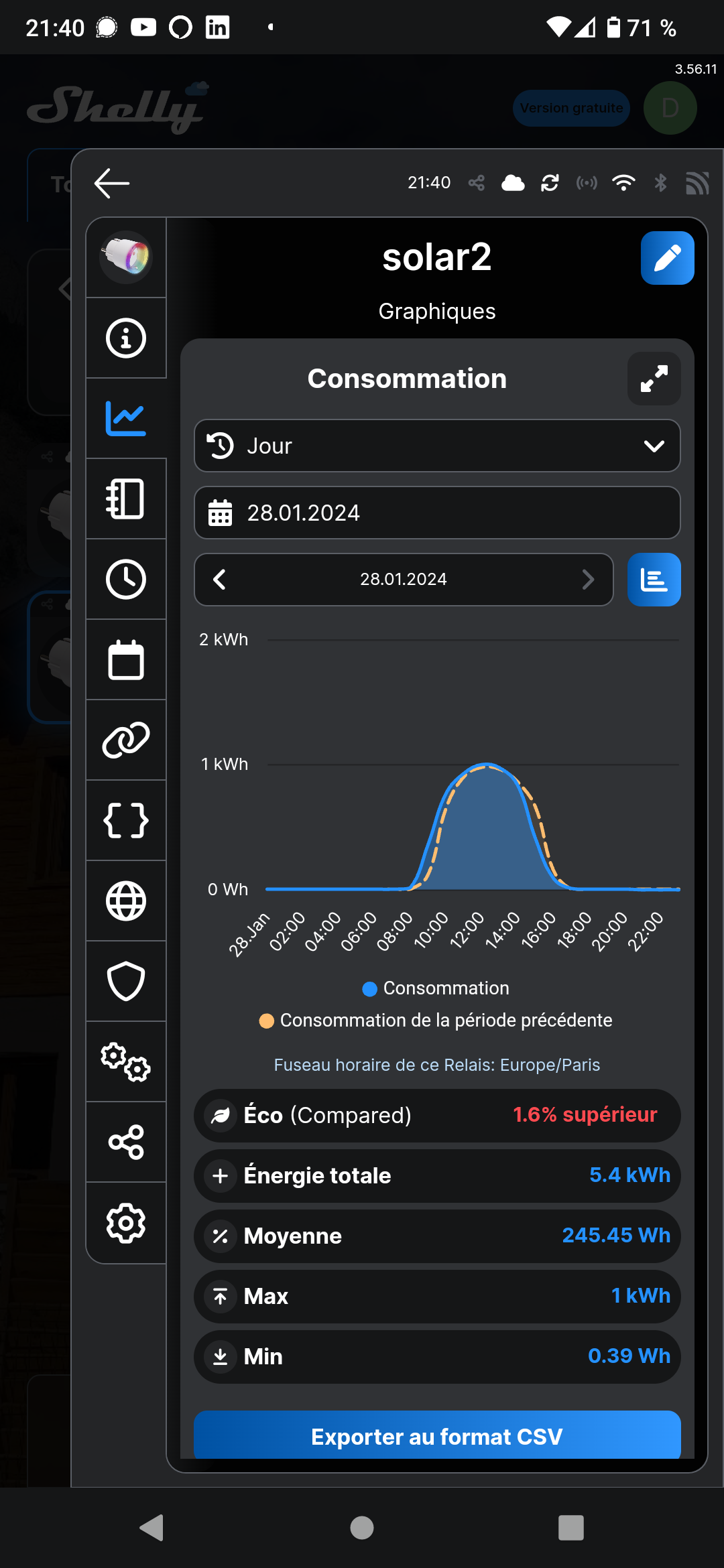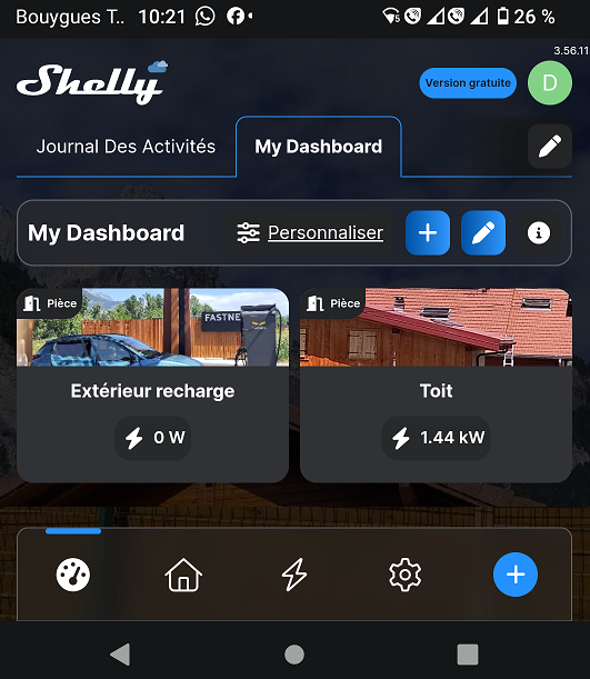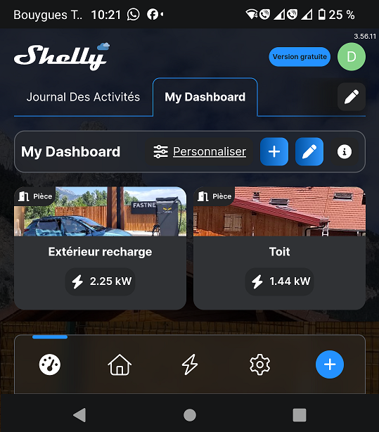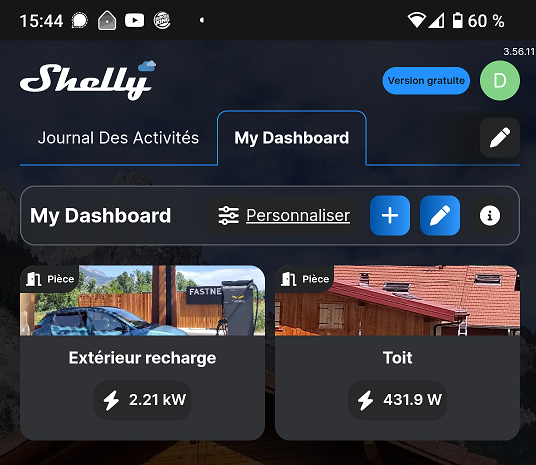 | 10h21 : Energie photovoltaique > 1kw (identification : Toit dans l’apps) Lancement du scénario de recharge de la voiture… Outils de mesure et de pilotage : 3 prises Shelly à 23€ (Shelly Plus Plug S) 1 prise pour mesurer la production du lot1 de 4 panneaux 1 prise pour mesurer la production du lot2 de 4 panneaux 1 prise pour le pilotage de la prise de recharge de la voiture | ![]() |