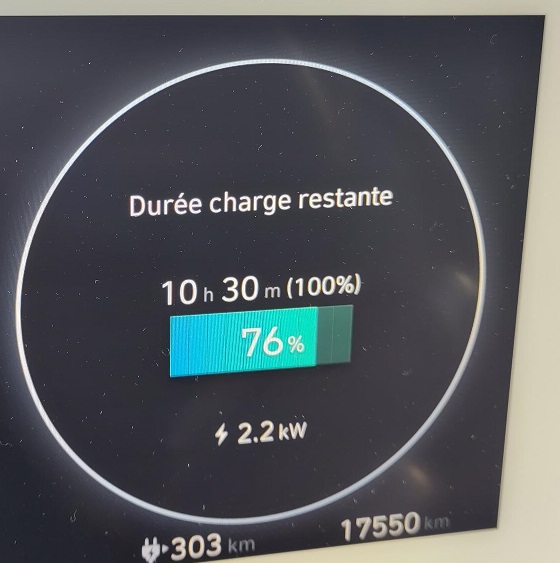 | 10h21 : Niveau de batterie de la voiture au lancement de la charge. Avant recharge solaire : 76% de batterie Autonomie 303 km | ![]() |