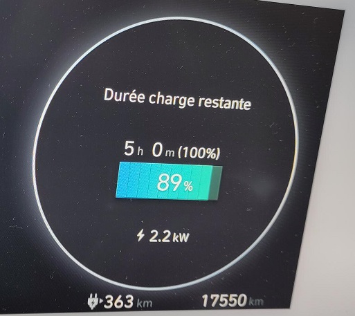 | 10h21 : La prise de pilotage de la recharge s’est déclenchée (via scénario automatique) La voiture est en chargement avec une puissance de 2,25Kw (identification : Extérieur recharge dans l’apps) Il est possible de décider au niveau de la voiture la puissance de charge : 1,2kwh, 1,8kwh ou 2,2kwh j’ai mis le Max car au max de la production solaire, je dépasse les 2Kw | ![]() |