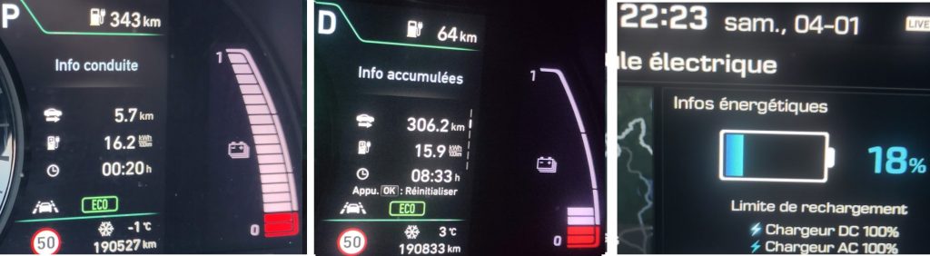 Avec 100% la voiture m’indiquait une autonomie de 343 km mais dans la réalité j’ai parcouru 306km avec une consommation de 15,9kw/100km et il restait d’après la voiture 64km et 18% de batterie.