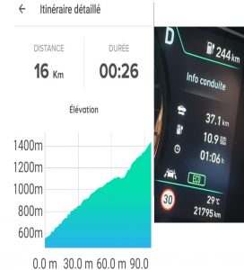Ce WE test d’un trajet AR avec gros dénivelé +900m sur 18,5km.Résultat impressionnant : pour la montée, consommation 37,7kw/100 mais au retour, avec la récupération d’énergie (vraiment très efficace du Kona via l’usage des palettes au volant), la consommation moyenne est redescendue à 10,9kw pour 37km.