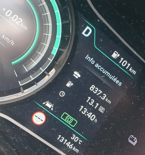 Et les informations totales de conduite avec une consommation sur plus de 837km de 13.1kw au 100km (soit pour une batterie de 64kw => 488km d’autonomie