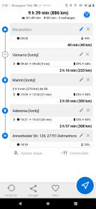 9h40 prévues par ABRP avec 3 arrêts recharge de respectivement 9, 21 et 20 min (50min en cumulé). Au final nous aurons circulé 12h dont 4 arrêts recharge de 20, 22, 23 et 19min (84 en cumulé) et réellement sur la route : 9h25. Côté temps sur la route on est conforme aux prévisions ABRP. …